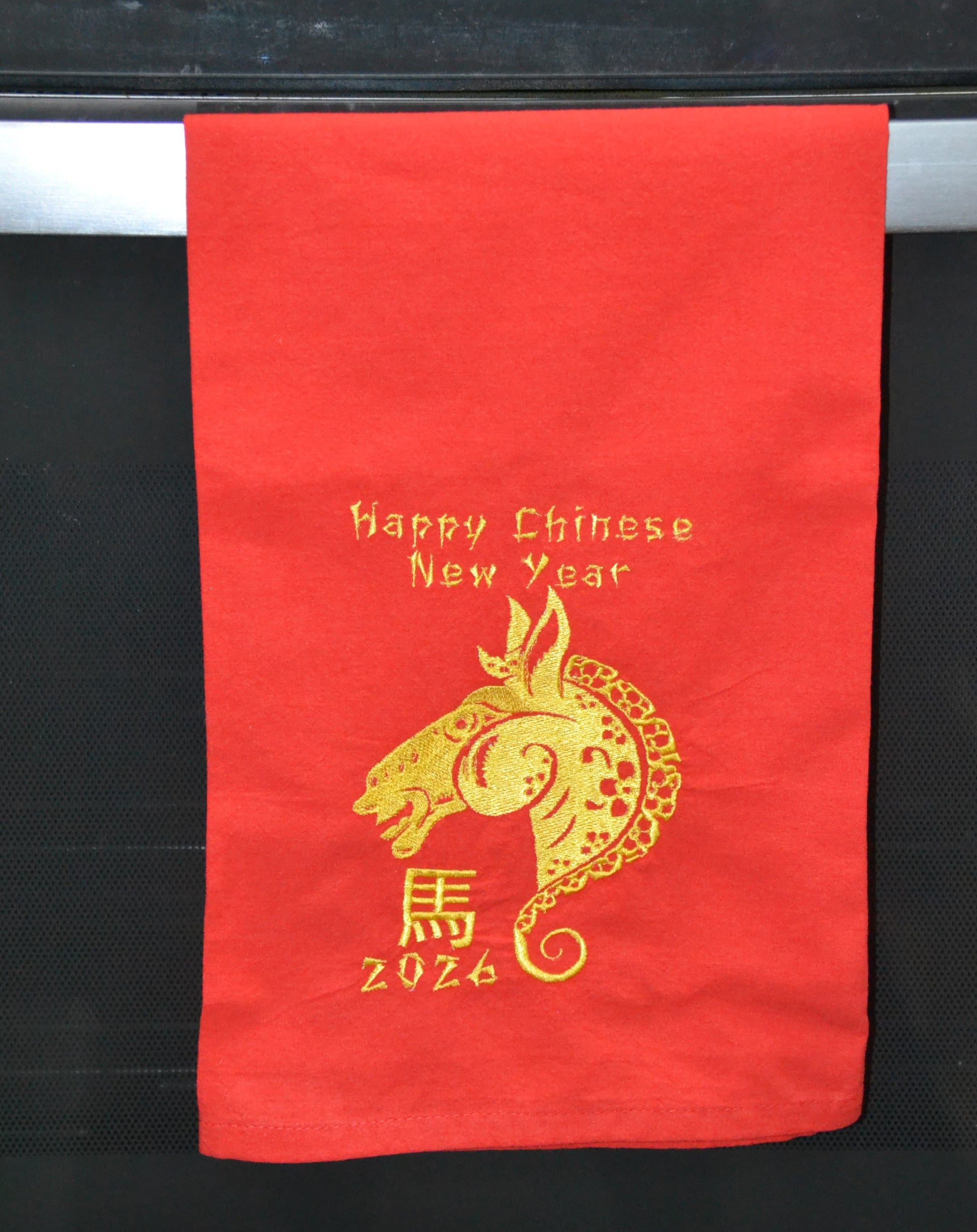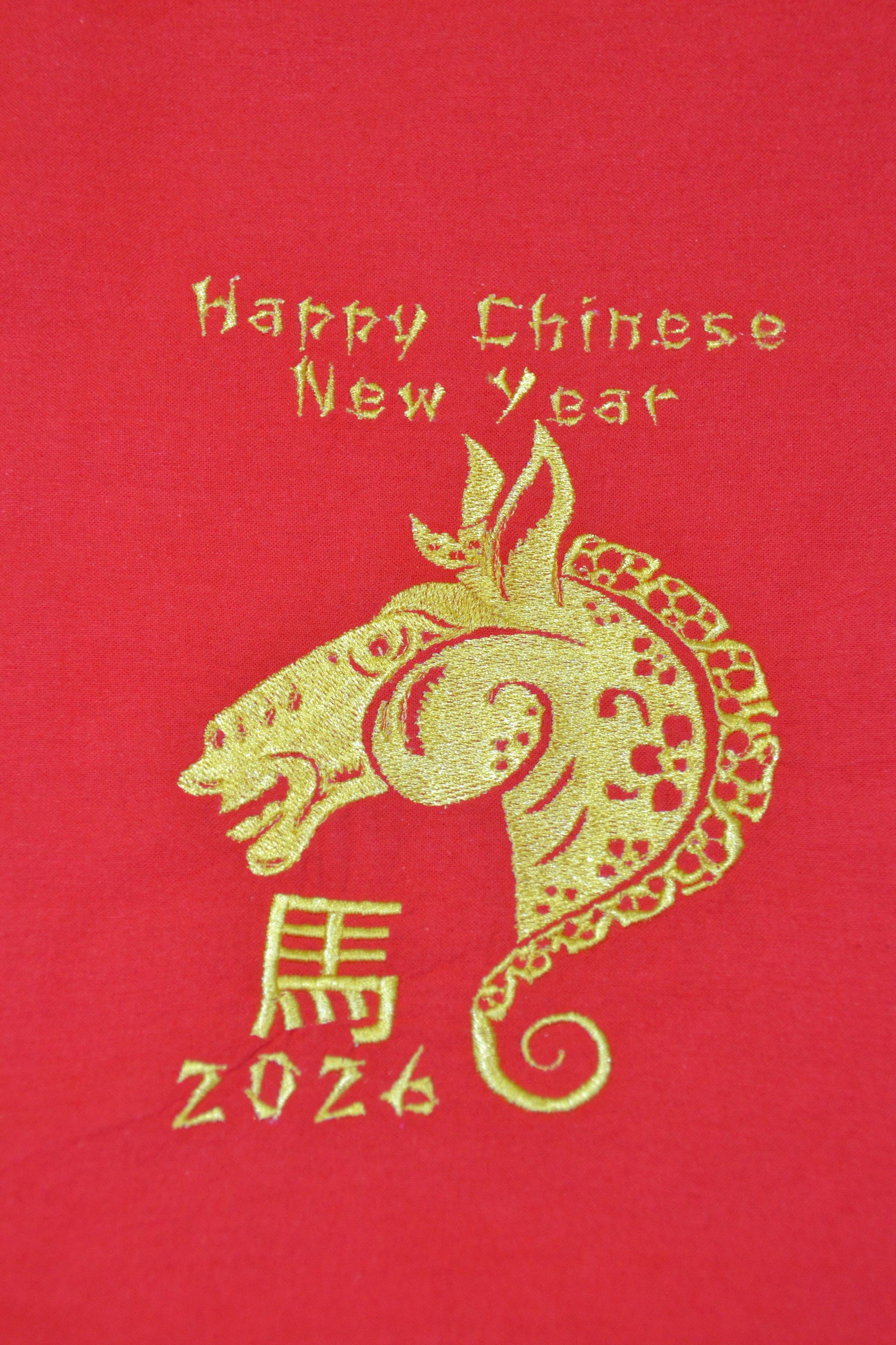 DESIGN DETAILS: Features a 6x4 inch gold embroidered horse design with "Happy Chinese New Year 2026" text, centered at the bottom when folded in thirds