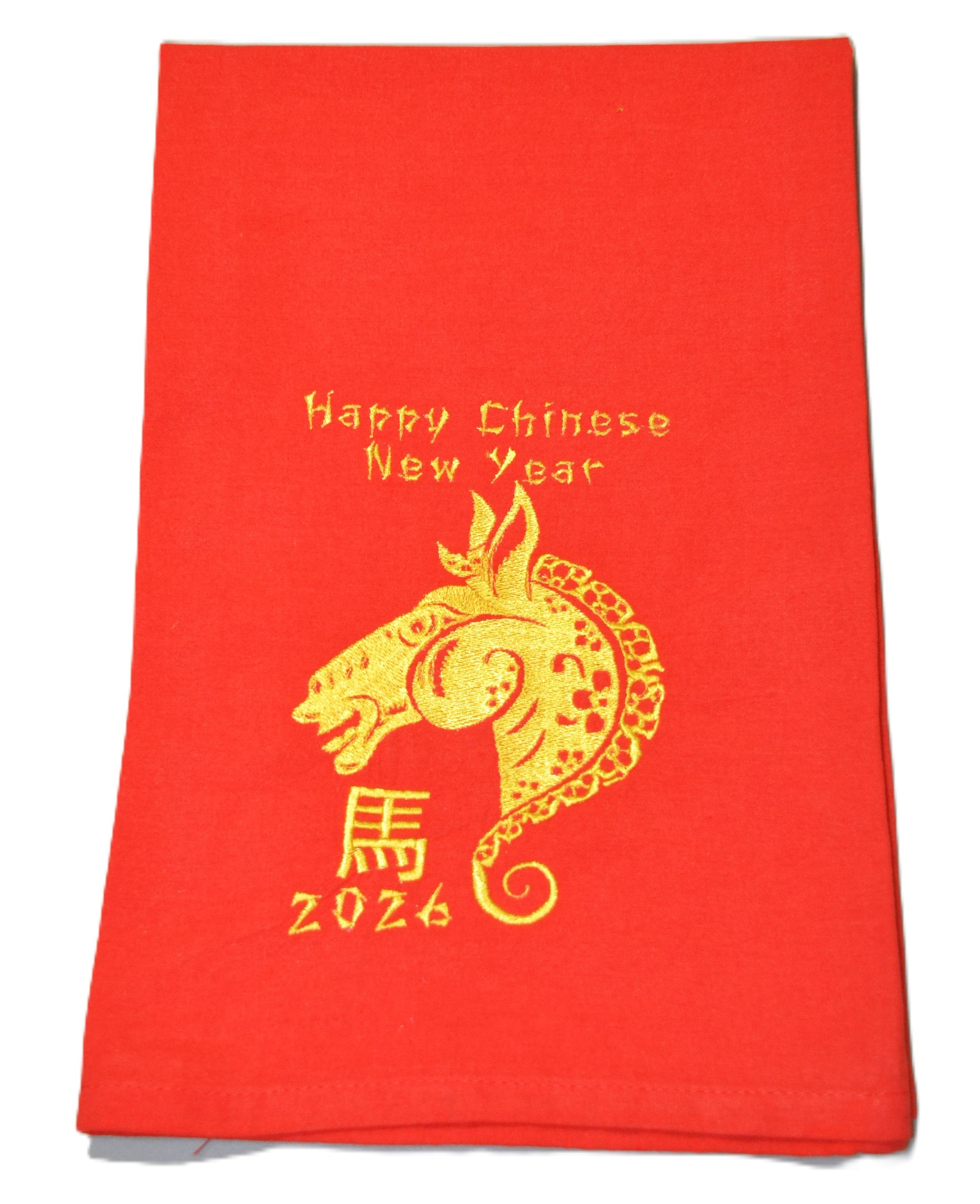 Chinese New Year 2026 Red Cotton Flour Sack Kitchen Towel, Decorative Horse Zodiac Design, Extra Large, Gold Embroidered