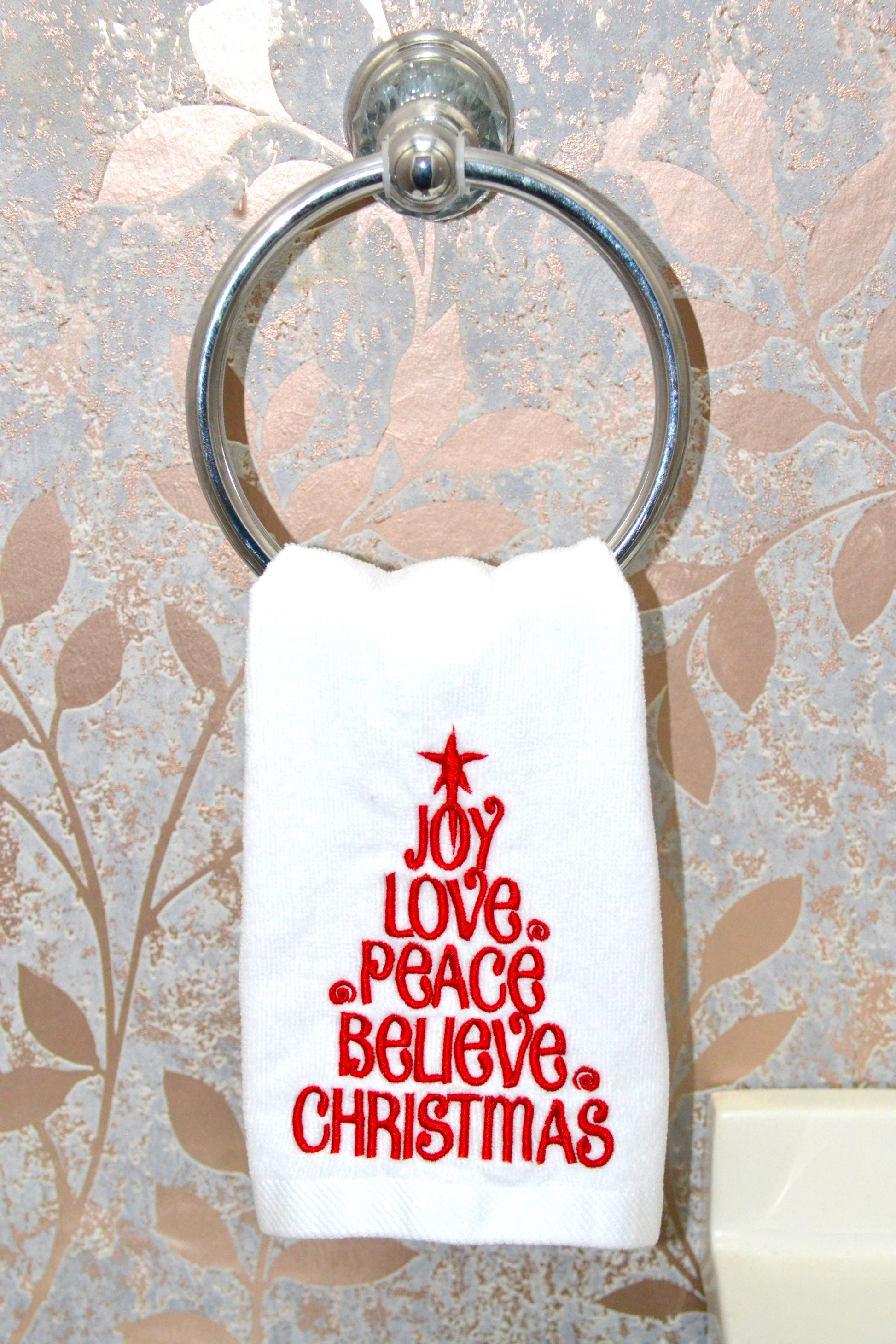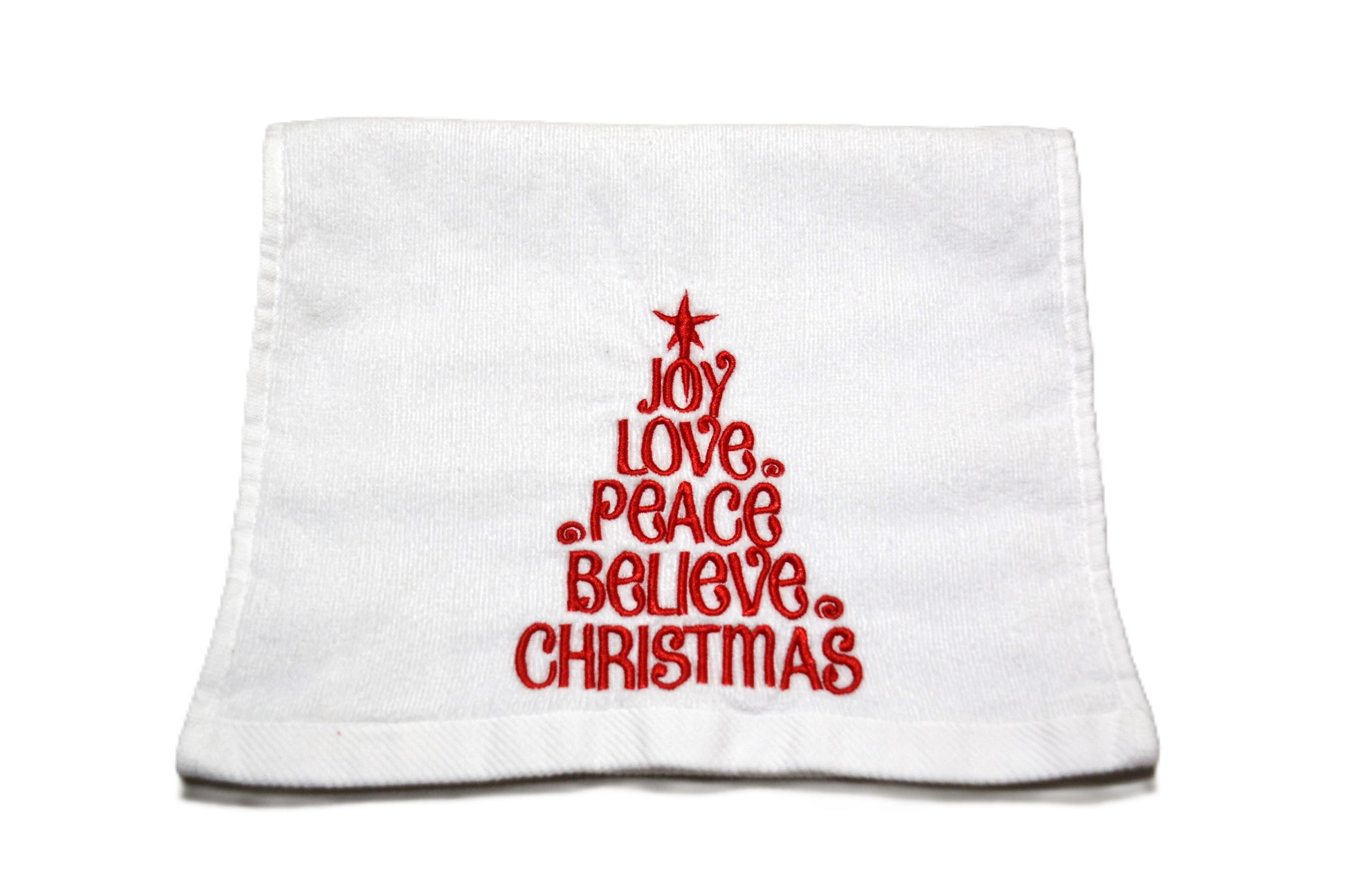 Elevate your holiday décor with this exquisite Christmas Holiday Words Tree Hand Towels set of two, featuring intricate embroidered red letters that spell out festive sentiments. This thoughtfully crafted towel transforms a practical bathroom essential into a decorative statement piece that captures the magic of the season. The elegant embroidered design makes it an exceptional gift for those who appreciate quality craftsmanship and holiday charm. Soft, absorbent, and built to last, this versatile set is perfect for displaying on towel racks, guest bathrooms, or gifting to loved ones who cherish seasonal elegance. Each towel measures 16x26 inches in crisp white, providing the ideal size for everyday use while maintaining its decorative appeal. The durable construction ensures these towels withstand repeated washing without fading or losing their embroidered detail. Whether you're refreshing your own bathroom or searching for a meaningful holiday present, this set brings warmth and sophistication to any home. Celebrate the joy of Christmas with a gift that combines functionality with festive beauty. Note: Colors may differ slightly due to screen resolution.